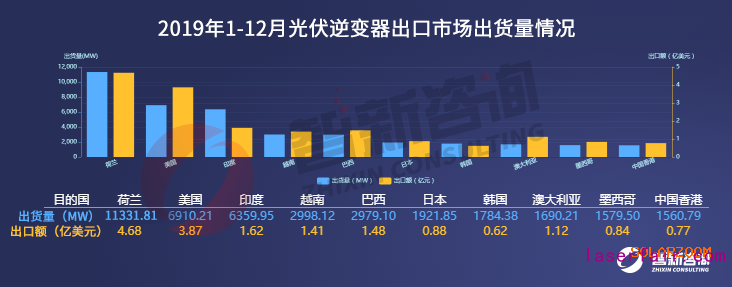 根據(jù)智新咨詢統(tǒng)計,2019年中國光伏組件、電池、逆變器主要出口國家(地區(qū))如下: