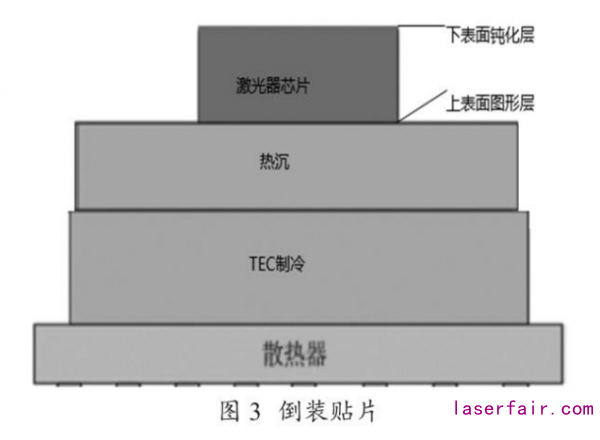 圖 3 為倒裝貼片圖。倒裝貼片封裝仍采用 TEC 方式,傳統(tǒng)的貼激光器芯片和熱沉貼片方式采取芯片正面朝上, 背面冷卻面和熱沉通過(guò)焊料相連接, 但芯片有源區(qū)發(fā)熱量主要是集中在上表面幾個(gè)微米的區(qū)域發(fā)熱, 上表面和下表面的一般有上百微米的距離,熱量通過(guò)這么長(zhǎng)距離的傳導(dǎo)到熱沉,再到TEC 制冷,散熱效果有限。