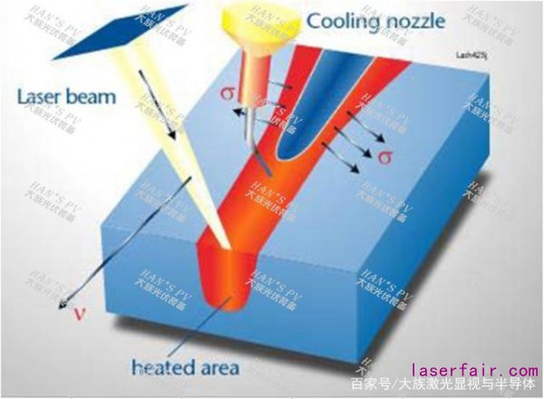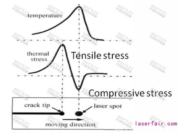 無損激光劃裂核心原理是激光熱應(yīng)力控制斷裂技術(shù)。首先利用激光對(duì)材料進(jìn)行局部快速加熱,隨后配套冷卻技術(shù)產(chǎn)生一個(gè)不均勻的溫度場(chǎng),不均勻的溫度場(chǎng)會(huì)在材料表面產(chǎn)生溫度梯度,從而誘發(fā)熱應(yīng)力的產(chǎn)生。其中激光光斑中處于壓應(yīng)力狀態(tài),而激光光斑前后處于拉應(yīng)力狀態(tài),由于脆性材料抗壓剛度遠(yuǎn)大于抗拉強(qiáng)度,當(dāng)拉應(yīng)力達(dá)到材料的斷裂強(qiáng)度時(shí),就會(huì)使材料從電池片邊緣開的超小槽口開始斷裂,進(jìn)而隨著激光及后續(xù)冷卻的移動(dòng)軌道穩(wěn)定擴(kuò)展,見圖四、圖五。
