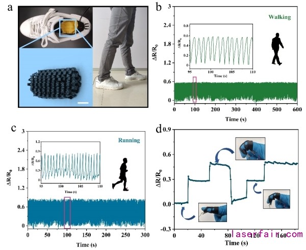 中國科學院功能納米結構設計與組裝/福建省納米材料重點實驗室研究員吳立新課題組基于可逆共價鍵,合成了可水解的交聯(lián)劑,在3D打印光敏樹脂中添加這種交聯(lián)劑能夠提高打印分辨率,打印的模具可在熱水中溶解。將聚氨酯/碳納米管復合材料澆注于模具中,在熱水中除去模具,得到各種多孔結構的傳感器,該傳感器具有高拉伸、高回彈的特點。研究人員結合3D打印形狀的可設計性,制備出多孔的手指套、鞋墊以用于檢測人體運動。相關研究成果發(fā)表在Advanced Functional Materials上,博士研究生彭樞強為論文第一作者,高級工程師翁子驤和吳立新為論文的通訊作者。