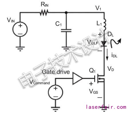 Q1和DL分別是待激活的激光器的開(kāi)關(guān)和LED。一旦控制器關(guān)閉,C1電容器就立即充電至VIN電壓。當(dāng)Q1導(dǎo)通時(shí),C1通過(guò)DL和L1電感放電,從而就形成了諧振電路。因此,流過(guò)激光器的電流就是正弦脈沖iDL,直到LED兩端的電壓高于其正向電壓VDLF為止。當(dāng)DL上的電壓小于VDLF時(shí),C1再次開(kāi)始充電。