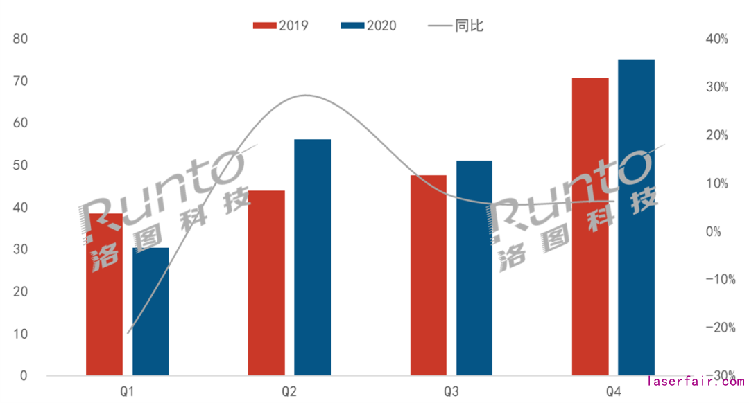 根據(jù)洛圖科技(RUNTO)發(fā)布的《中國大陸激光投影市場分析季度報告》中顯示,2020年中國大陸激光電視市場出貨量超過21.2萬臺,同比增長5.9%。1季度受疫情影響,國內(nèi)激光電視市場同比衰退;2季度產(chǎn)業(yè)鏈加快復(fù)工復(fù)產(chǎn),品牌積極促銷,激光電視市場回暖,出貨量同比增長近28%;3、4季度激光電視出貨量盡管仍然錄得同比增長,但增幅都在個位數(shù)。主要原因包括2019年同比基數(shù)較高、2020年新品較少、品牌促銷力度有限、銷售渠道拓展節(jié)奏緩慢、其它競品市場擠壓。