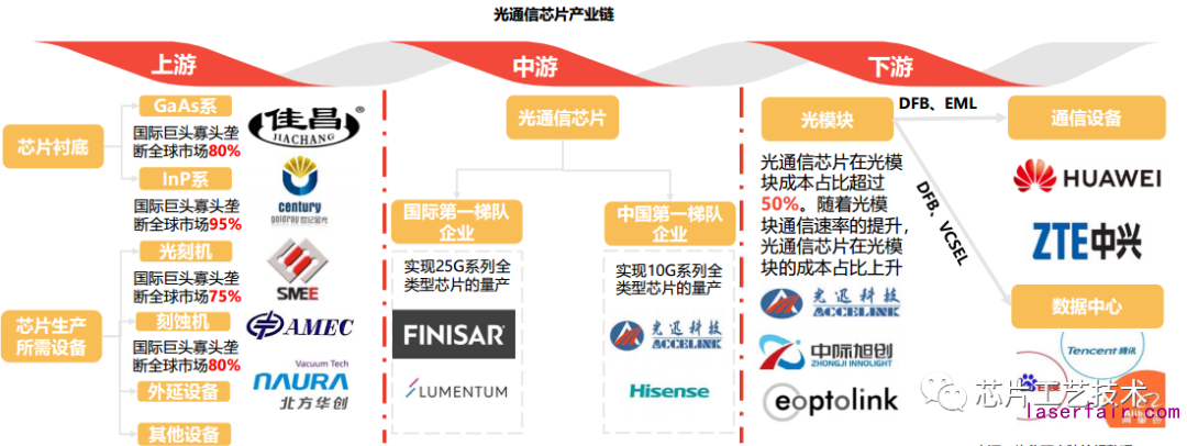 從光通信的傳輸工作原理上看,激光芯片屬于源頭的有源芯片。