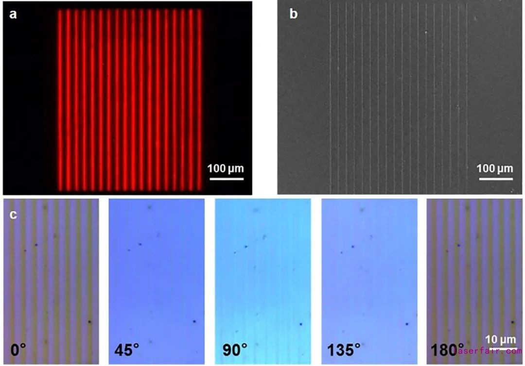 通過改變激光寫入的參數(shù),研究者制作了周期為4 μm的熒光光柵。如圖2所示,所得的光柵具有均勻且周期性的結(jié)構(gòu),且表現(xiàn)出顯著的偏振調(diào)制特性。圖2 激光直寫制備鈣鈦礦發(fā)光光柵及其偏振特性