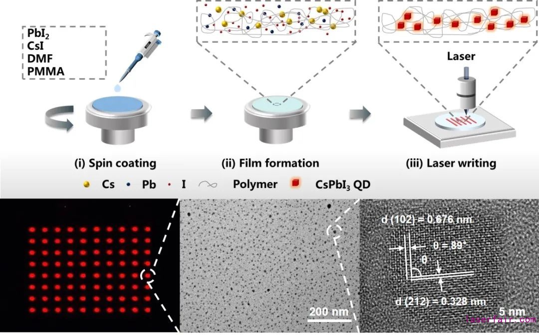 該研究主要基于聚合物與鈣鈦礦量子點導(dǎo)熱率的差異,利用405 nm納秒激光作為光源,通過對包含鈣鈦礦前驅(qū)體的聚合物薄膜進行激光直寫,實現(xiàn)了γ-CsPbI3鈣鈦礦量子點的圖案化制備。