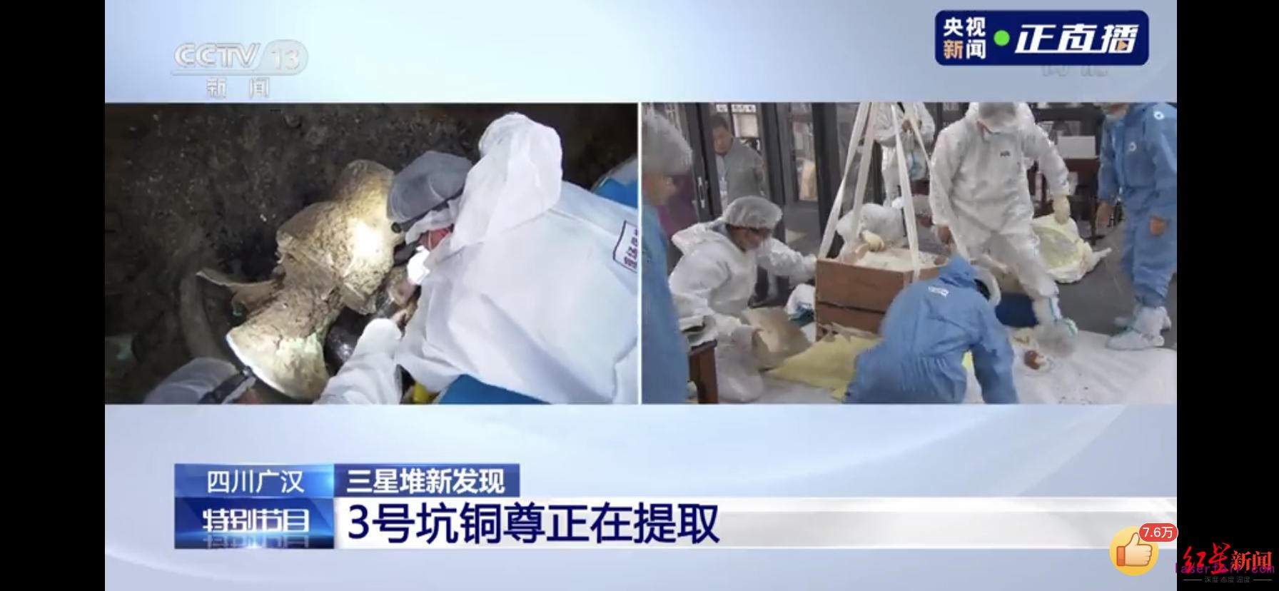 今日(3月21日),考古隊員對3號坑的一尊重達(dá)200斤以上的銅尊進行提取。據(jù)了解,這件銅尊是此次考古發(fā)現(xiàn)的最大一件銅尊。為了將這個“大家伙”安全提取出,在之前,考古人員已對該銅尊用石膏進行澆筑。最大銅尊出土