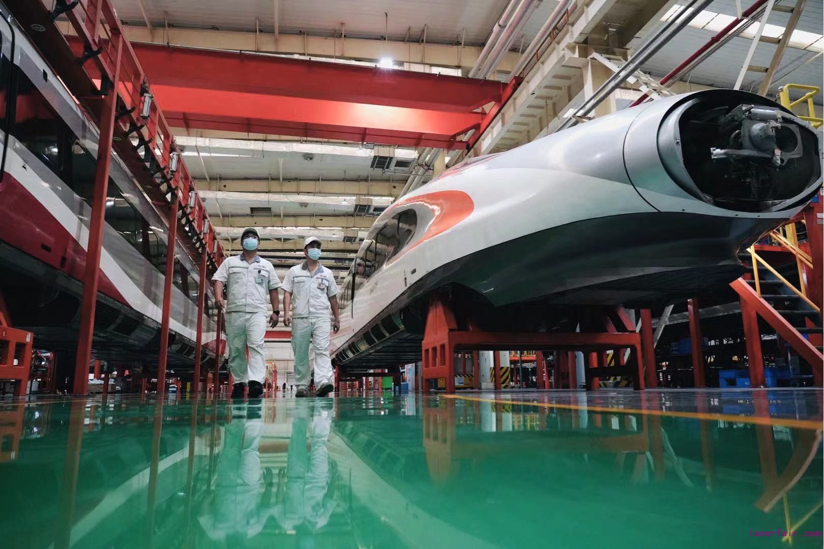在廣東江門火車站一側(cè)的中車廣東軌道交通車輛有限公司廠房內(nèi),來自香港、深圳、廣州等地的地鐵車輛在偌大的車間一字排開等待維護(hù)與檢修;總裝車間內(nèi),數(shù)節(jié)城際列車車廂...