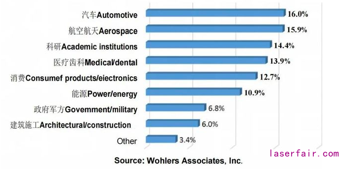 △3D打印行業(yè)權(quán)威Wohlers 2021報告,汽車行業(yè)是3D打印應(yīng)用的第一大行業(yè),占16%的比重;航空航天、科研、醫(yī)療齒科等緊跟其后