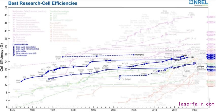 根據(jù)IHS的數(shù)據(jù),當(dāng)前硅基太陽電池占據(jù)市場(chǎng)份額的95%,其中以單晶硅電池為主。單晶晶面取向相同、無晶界,在晶體品質(zhì)、電學(xué)性能、機(jī)械性能等方面具備優(yōu)異品質(zhì)和更高的轉(zhuǎn)換效率。根據(jù)2021年4月1日美國國家可再生能源實(shí)驗(yàn)室最新發(fā)布的不同類型的太陽能電池最高效率數(shù)據(jù),在實(shí)驗(yàn)室條件下各類型電池效率不斷刷新,不過單晶硅電池一直比多晶硅電池效率高,商業(yè)化大規(guī)模應(yīng)用的非聚光單晶硅電池最高效率26.1%、多晶硅電池最高效率23.3%;其他新型電池尚未進(jìn)入規(guī)?;虡I(yè)化應(yīng)用階段,其實(shí)驗(yàn)室最高效率依次為聚光單晶硅電池27.6%,異質(zhì)結(jié)晶硅電池26.7%,薄膜晶硅電池21.2%(見圖5)。圖5 美國國家可再生能源實(shí)驗(yàn)室(NREL)硅基