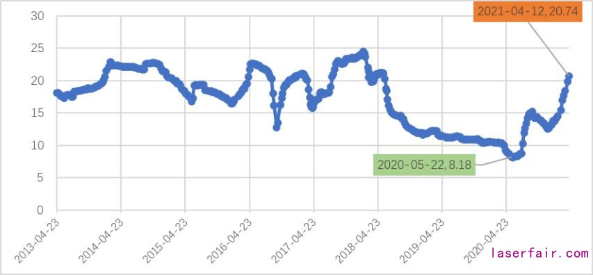 硅料是硅片成本的重要組成部分,并且隨著硅片技術(shù)的進(jìn)步,硅料成本占比進(jìn)一步上升。硅片企業(yè)提升供應(yīng)鏈管理能力,能夠抵御上游硅料價(jià)格大幅波動(dòng)是實(shí)現(xiàn)硅片企業(yè)贏得競(jìng)爭(zhēng)優(yōu)勢(shì)的關(guān)鍵因素之一。2013年以來多晶硅價(jià)格相對(duì)比較穩(wěn)定,去年以來多晶硅價(jià)格從低位10美元/kg以下增長(zhǎng)到20美元/kg以上,價(jià)格大幅上升給硅片企業(yè)帶來了巨大的沖擊(見圖4)。圖4 多晶硅價(jià)格走勢(shì)(美元/kg)
