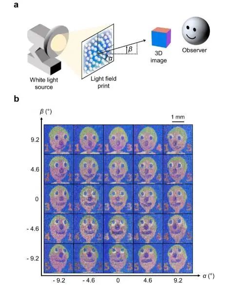 (a) 光場打印工作原理示意圖。(b) 從不同角度觀察到的光場打印