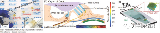 圖 8 (網絡版彩圖) (a) 分頻器上完整的IPANS單元和玻璃棒上的PZT薄膜設備; (b) 哺乳動物耳蝸中柯蒂氏器官的概念示意圖; (c) 有機硅基底膜通過聲波振動, 導致人造基底膜上PZT薄膜的機械變形[77]. 圖片來自文獻[77], 已獲得授權