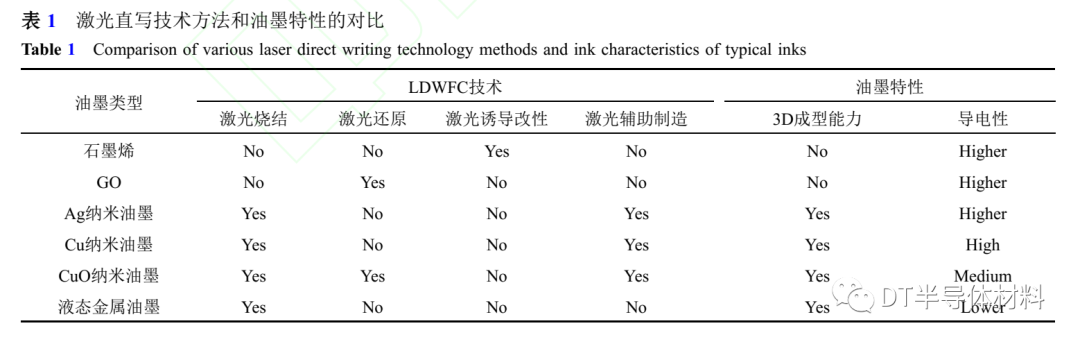 總而言之,上述用于LDWFC的激光加工技術現階段已經取得很好的進展,每種技術各有特點,適用的油墨種類也有所差別。在LDWFC中仍然存在一些挑戰(zhàn):如何提高柔性電路的各項特性,如何改善激光直寫過程中的工藝方法,如何研制出性能優(yōu)異的導電油墨,仍然是未來需要關注的重點方向。這里我們簡單對比了激光直寫技術方法以及油墨特性,如表1所示。