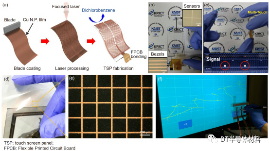 圖 9 (網絡版彩圖) (a) Cu柵網格的TSP一步制造示意圖; (b), (c) 演示制造的電容型多點觸摸板[78]; (d), (e) 通過激光燒結CuNps在PEN膜上的柔性Cu柵透明導體; (f) 在柔性PEN膜上的觸摸屏演示圖[79]. 圖片來自文獻[78,79], 已獲得授權