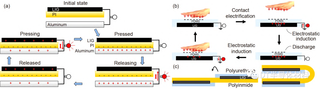 圖 6 (網絡版彩圖) (a) 使用LIG/PI雙層復合膜的TENG工作示意圖, 其中LIG為一個電機, PI為電介質層; (b) 基于LIG/PDMS合材料組成的TENG工作示意圖; (c) 由單張PI制成的柔性無金屬TENG示意圖[75]. 圖片來自文獻[75], 已獲得授權