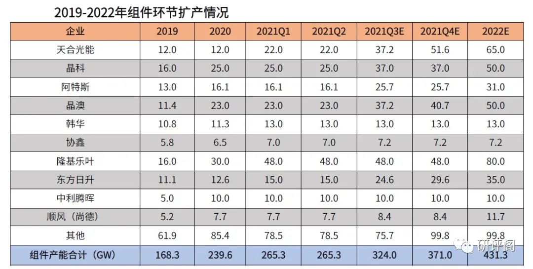 組件價(jià)格最近也在下降,這對(duì)裝機(jī)量有推動(dòng)作用,目前看擴(kuò)產(chǎn)比較大的是天合光能和晶科。如果硅料價(jià)格與組件價(jià)格達(dá)到所謂的均衡,那么組件將維持1.75-1.8元/W。
