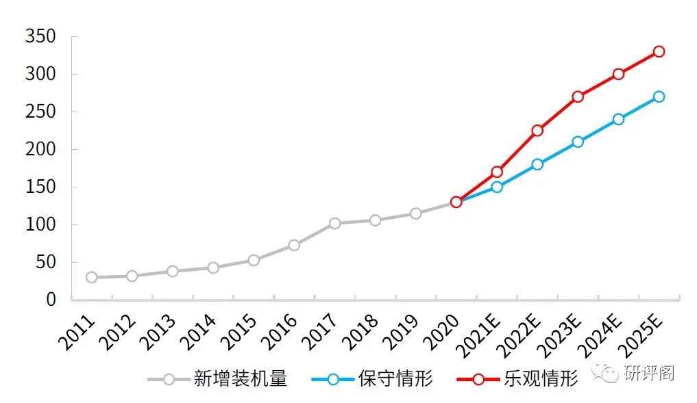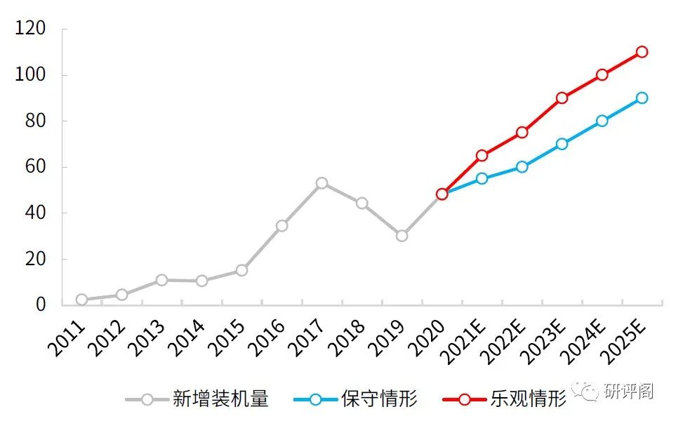 從需求預(yù)測(cè)看,預(yù)計(jì)2021年我國(guó)光伏裝機(jī)50-60GW,隨后幾年穩(wěn)定增長(zhǎng),樂(lè)觀估計(jì),到2025年將達(dá)到80GW左右。