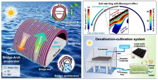 3D橋拱形蒸發(fā)器示意圖、雙層液膜排鹽機(jī)理與海水淡化-作物種植連動(dòng)系統(tǒng)