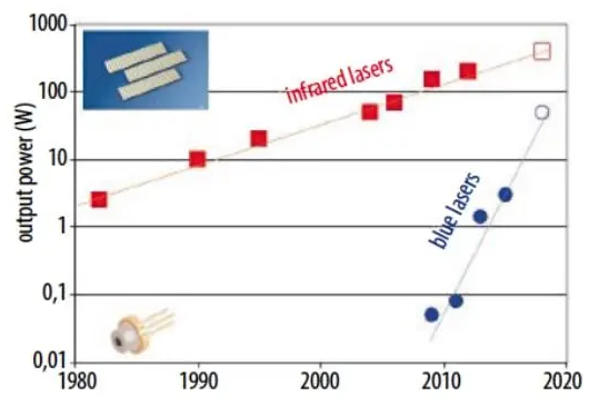 應(yīng)用于材料加工的激光光源發(fā)展迅速。全新藍(lán)光激光棒的光功率可以高達(dá)100瓦。紅外激光棒可實(shí)現(xiàn)以前被認(rèn)為幾乎無法企及的效率。大功率激光二極管作為材料加工激光系統(tǒng)的光源正在發(fā)揮著越來越重要的作用。紅外激光棒具有極高的光功率,其功率和效率目前已達(dá)到一個(gè)全新水平。另外,值得注意的是藍(lán)光波長激光棒,其在實(shí)驗(yàn)室中的光功率可達(dá)100瓦(W)。這是一個(gè)巨大飛躍,因?yàn)椴坏绞昵?,藍(lán)光激光二極管只有幾瓦的功率。高功率密度令激光輻射成為一種高效的工具,可以將定量的能量傳輸?shù)焦ぜ囟▍^(qū)域,并在非接觸的情況下對這些區(qū)域進(jìn)行精確加熱。典型的應(yīng)用包括各種金屬和塑料的雕刻、涂層、焊接和切割等。根據(jù)VDMA 2019的《激光技術(shù)世界》統(tǒng)計(jì),目前用于金屬切割和焊接的大功率激光工具占據(jù)了全球材料加工激光系統(tǒng)45%左右的市場份額。目前,大功率半導(dǎo)體激光器的應(yīng)用也越來越廣泛,它既可直接用作激光加工工具,也可以用于泵浦光纖或固態(tài)激光器。與二氧化碳激光器或閃光燈抽運(yùn)固態(tài)激光器相比,它的效率更高,結(jié)構(gòu)更緊湊。其核心是半導(dǎo)體激光二極管,通常為光功率較高的激光棒。多個(gè)激光棒堆疊在一起可用作工業(yè)半導(dǎo)體激光器的光源,此類激光器的光功率目前可以達(dá)到100千瓦(kW)。用于材料加工的激光二極管的核心參數(shù)包括波長、光功率、電光轉(zhuǎn)換效率(WPE)和光束質(zhì)量。這些是衡量一個(gè)完整系統(tǒng)效率以及成本效益的必需參數(shù)。較高的光功率和效率可減少系統(tǒng)所需的激光芯片數(shù)量,從而降低耦合和冷卻成本以及光學(xué)系統(tǒng)復(fù)雜性。光束質(zhì)量決定了可以耦合進(jìn)光纖的激光功率的大小,適當(dāng)?shù)牟ㄩL則能夠確保加工材料充分吸收激光能量。目前,由于大多數(shù)使用激光加工的材料可吸收約1 μm波長的光,所以在激光加工行業(yè)中,紅外激光器的應(yīng)用得到了較為廣泛的普及。銅是電氣工程中最重要的原材料之一,在電池、電機(jī)或斷路器的電力傳輸?shù)确矫姘l(fā)揮著核心作用。例如,在用于電動(dòng)汽車或儲(chǔ)能系統(tǒng)的鋰離子電池中,每個(gè)電池通過銅介質(zhì)實(shí)現(xiàn)連接導(dǎo)通。這時(shí),由于高工作電流,這些連接會(huì)受到較高熱應(yīng)力的影響。傳統(tǒng)的焊接接頭在這樣的情況下會(huì)不夠穩(wěn)定,因此激光焊接的應(yīng)用實(shí)現(xiàn)了高速的增長。但是銅會(huì)反射大量紅外波長,其他有色金屬(如金或鋁)也有類似情況(圖1)。如果采用紅外激光來進(jìn)行加工,就需要非常高的激光功率。除了能耗高之外,工藝的可控性也相對較差。一旦銅在高溫下熔化,它就會(huì)大量吸收紅外光。當(dāng)融化的銅“沸騰”后,會(huì)形成孔隙并產(chǎn)生飛濺。焊接質(zhì)量差也會(huì)影響其導(dǎo)電性等性能。圖1顯示了金和銅的光譜吸收對比情況。銅吸收藍(lán)光的能力是紅外光的12倍,同時(shí)也是綠光的1.2倍。對于金來說,這些系數(shù)分別為50和2.2。因此,在加工中,當(dāng)波長低于500 nm時(shí),可實(shí)現(xiàn)最高的系統(tǒng)效率。圖1:銅、金等有色金屬對藍(lán)光的吸收能力比紅外波長強(qiáng)得多。目前藍(lán)光工業(yè)半導(dǎo)體激光器的光功率可達(dá)到幾百瓦到幾千瓦。開發(fā)基礎(chǔ)的大功率藍(lán)光激光二極管是其中的關(guān)鍵任務(wù)。在不到十年前,其輸出功率還在毫瓦至幾瓦范圍內(nèi),可用于藍(lán)光驅(qū)動(dòng)器、投影機(jī)或汽車頭燈等應(yīng)用?,F(xiàn)在,藍(lán)光激光二極管迎來了高速的發(fā)展,輸出效率和功率有了長足的提升。艾邁斯歐司朗不斷提高其450 nm單個(gè)發(fā)射器的效率,從2008年功率為60毫瓦時(shí)15%的效率提高至現(xiàn)在功率為2.2瓦時(shí)效率達(dá)到46%。為了將工業(yè)二極管激光器光源用于有色金屬加工,必須繼續(xù)提高其將其性能水平。作為政府資助的光子計(jì)劃(EFFILAS)的組成部分,BLAULAS項(xiàng)目致力于開發(fā)更高功率和效率的藍(lán)光激光器和相應(yīng)的高功率激光二極管。圖2:艾邁斯歐司朗光電半導(dǎo)體在10年內(nèi)將藍(lán)光激光二極管的轉(zhuǎn)換效率提高近三倍。與紅外系統(tǒng)類似,藍(lán)光系統(tǒng)也依賴于大功率激光棒。一開始,專家們對這種方法能否成功用于銦鎵氮(InGaN)材料系統(tǒng)表示懷疑。因?yàn)樗哂邢鄬^高的晶體缺陷密度,甚至在某些情況下,具有缺陷的發(fā)射點(diǎn)可能會(huì)破壞整個(gè)激光棒。因此,第一步需要驗(yàn)證和改進(jìn)芯片制程和一致性,接下來是從設(shè)計(jì)和工藝步驟上進(jìn)行優(yōu)化。2018年,艾邁斯歐司朗推出了全球首款藍(lán)光激光棒。在實(shí)驗(yàn)室中,這款激光棒可在60 A的電流下實(shí)現(xiàn)98 W的輸出功率。功率為50 W時(shí)的最高效率達(dá)到46%。2019年,開發(fā)人員將其功率突破了100 W大關(guān),達(dá)到107 W。這款激光棒寬9.2 mm,腔長1.2 mm,由23個(gè)發(fā)射器組成,每個(gè)發(fā)射器的孔徑寬度為30 μm。400 μm的間距可確保7.5%的低填充系數(shù),這可防止相鄰發(fā)射器之間的熱串?dāng)_,并避免產(ch