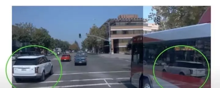 右側(cè)大巴車(chē)明顯的印出了左側(cè) SUV 的模樣,攝像頭碰到這情況就蒙圈了,極有可能出現(xiàn)智能駕駛系統(tǒng)決策判斷的失誤。