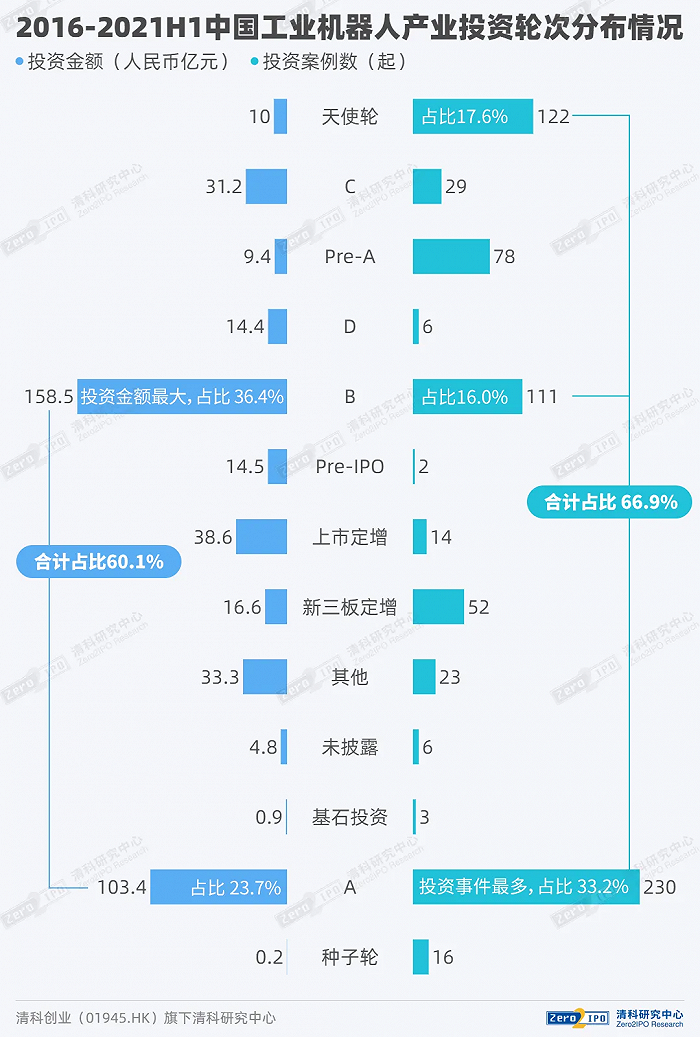 根據(jù)清科創(chuàng)業(yè)旗下PEDATA MAX數(shù)據(jù),2016-2021H1,中國工業(yè)機器人領(lǐng)域披露投資事件692起,披露投資金額約435.9億元;零部件制造和集成應(yīng)用環(huán)節(jié)投資熱度較高;A輪、天使輪及B輪案例數(shù)合計占比近7成;廣東、北京和長三角地區(qū)是熱點地域。