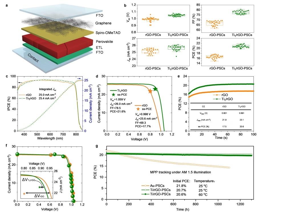 作為第三代新興光伏技術(shù),有機(jī)-無機(jī)雜化鈣鈦礦太陽能電池(PSCs)近10年來能量轉(zhuǎn)換效率突飛猛進(jìn),經(jīng)國際權(quán)威機(jī)構(gòu)認(rèn)證的效率高達(dá)25.5%,已接近單晶硅太陽能電池(26.7%)。憑借成本低廉、制備工藝相對簡單、可柔性化、弱光可發(fā)電等諸多優(yōu)點(diǎn),PSCs在光伏領(lǐng)域展現(xiàn)出了巨大應(yīng)用前景,其發(fā)展受到各國學(xué)者和產(chǎn)業(yè)界的廣泛關(guān)注。當(dāng)前,PSCs長期穩(wěn)定性以及貴金屬電極材料產(chǎn)生的成本問題仍然是阻礙PSCs大規(guī)模應(yīng)用的主要障礙。PSCs目前廣泛使用的Au/Ag等貴金屬電極除了價(jià)格昂貴外,還存在易與鈣鈦礦中的鹵素離子發(fā)生化學(xué)反應(yīng)、進(jìn)而被腐蝕的問題,降低了電池的長期穩(wěn)定性。以廉價(jià)的碳電極取代貴金屬電極是提升PSCs穩(wěn)定性并降低成本的有效策略,然而由于界面接觸、能級失配和電荷傳輸動力學(xué)遲緩等問題,碳基PSCs能量轉(zhuǎn)換效率一直處于相對較低的水平(絕大多數(shù)都不超過18%)。如何提升碳基PSCs能量轉(zhuǎn)換效率,是本領(lǐng)域亟待破解的難題之一。圖1 Ti1-rGO的制備示意圖及其形貌結(jié)構(gòu)表征近日,我?;W(xué)院化學(xué)系史彥濤教授團(tuán)隊(duì)聯(lián)合瑞士洛桑聯(lián)邦理工Michael Gr?tzel教授團(tuán)隊(duì)及東南大學(xué)電子科學(xué)與工程學(xué)院朱超研究員,創(chuàng)新性地利用碳基負(fù)載金屬單原子電極材料Ti1/rGO,并結(jié)合一種更為先進(jìn)的器件結(jié)構(gòu),有效調(diào)控了碳基C-PSCs光生載流子界面轉(zhuǎn)移/傳輸動力學(xué),大幅減少了能量損失。以此為基礎(chǔ)制備的新型碳基PSCs能量轉(zhuǎn)換效率高達(dá)21.6%,遠(yuǎn)高于本領(lǐng)域先前報(bào)道器件性能(絕大多數(shù)<18%)。更加可喜的是,未封裝器件在25℃和60℃分別連續(xù)照射工作1300 h(氮?dú)獗Wo(hù),1 sun)后,能量轉(zhuǎn)換效率依然保持初始值的98%和95%,展現(xiàn)出了優(yōu)異的穩(wěn)定性。圖2 Ti1-rGO基C-PSCs的光電特性及穩(wěn)定性本項(xiàng)研究為進(jìn)一步推進(jìn)PSCs產(chǎn)業(yè)化提供了重要思路,其創(chuàng)新之處在于,首次將結(jié)構(gòu)明確的單原子材料(SAMs)應(yīng)用于全固態(tài)光電器件領(lǐng)域。研究結(jié)果表明,當(dāng)單原子Ti通過特定化學(xué)結(jié)構(gòu)負(fù)載于還原氧化石墨烯(rGO)時(shí),rGO的電子結(jié)構(gòu)發(fā)生顯著變化,引起費(fèi)米能級下降和功函數(shù)增大,使得Ti1/rGO與空穴傳輸層的能級更加匹配,有利于界面電荷轉(zhuǎn)移。其意義在于,不僅發(fā)展了一種調(diào)控碳材料電學(xué)特性的先進(jìn)方法,同時(shí)深化了對碳材料化學(xué)結(jié)構(gòu)與電學(xué)性能之間構(gòu)-效關(guān)系的理解,更加拓展了SAMs的應(yīng)用領(lǐng)域。其次,本項(xiàng)研究中所采用的器件結(jié)構(gòu)為疊合式碳基PSCs,是一種可實(shí)現(xiàn)模塊化制備和組裝的新型光伏器件,能夠完全不依賴真空沉積技術(shù),且可以使用廉價(jià)的電極材料,大幅降低了光伏器件設(shè)備和材料成本。更重要的是,這種新型器件結(jié)構(gòu)實(shí)現(xiàn)了光生電荷縱向提取和橫向傳輸過程的解耦,從根本上解決了傳統(tǒng)碳基PSCs器件電荷轉(zhuǎn)移動力學(xué)能量損失過大的問題。研究成果以“Ti1–graphene single-atom material for improved energy level alignment in perovskite solar cells”為題發(fā)表于能源領(lǐng)域知名期刊Nature Energy。該研究工作由校內(nèi)外多個(gè)課題組共同完成,我校為第一作者和第一通訊單位,我校博士生張春陽為共同一作(排名第一)。本項(xiàng)研究的參與單位包括洛桑聯(lián)邦理工學(xué)院、東南大學(xué)、香港科技大學(xué)、廈門大學(xué)、中科院大連化學(xué)物理研究所。本項(xiàng)研究獲得了國家自然科學(xué)基金、“興遼英才計(jì)劃”項(xiàng)目、大連市科技創(chuàng)新基金、遼寧省中央引導(dǎo)地方科技發(fā)展資金等資助。原文鏈接:https://www.nature.com/articles/s41560-021-00944-0