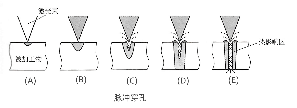 其過程如下圖所示:在激光束照射到被加工物上后,首先會加熱材料表面,如(A)所示;隨著加熱逐漸深入起到穿孔的作用,即(B)~(C)~(D),直到最后(E)所示的穿透。整個(gè)穿孔過程不是一次完成的,而是多次不斷循序漸進(jìn),逐漸深入,直到穿透。因此,該方法穿孔的時(shí)間相對較長;但是,得到的孔較小,對周圍的熱影響也更小。