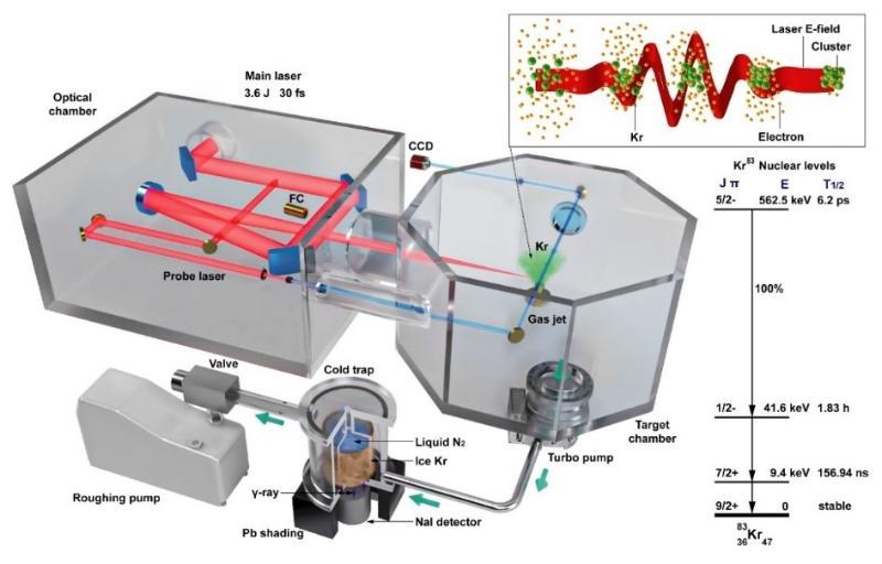 近期,上海交通大學(xué)張杰院士團(tuán)隊(duì)的陳黎明教授,與復(fù)旦大學(xué)馬余剛院士團(tuán)隊(duì)的符長波教授合作,將激光等離子體應(yīng)用于核物理研究。他們利用激光等離子體的極高密度的特點(diǎn),通過激光和近固體密度氪(Kr)團(tuán)簇的非線性共振加熱獲得高密度MeV能量的電子,首次實(shí)現(xiàn)了高密度快速振蕩的電子在數(shù)十飛秒內(nèi)庫倫激發(fā)83Kr原子核。對應(yīng)2.34×1015p/s的超高峰值效率激發(fā)核同質(zhì)異能態(tài)83mKr3,其泵浦效率高于傳統(tǒng)加速器約5個量級,從而克服了傳統(tǒng)激發(fā)方式較低密度的弱點(diǎn)。該工作成為短壽命核同質(zhì)異能素超快激發(fā)的首次實(shí)驗(yàn)驗(yàn)證,從而開啟了激光“等離子體激發(fā)器”這種全新的核激發(fā)方式,可廣泛應(yīng)用于各種核激發(fā)與核合成的研究與應(yīng)用。
