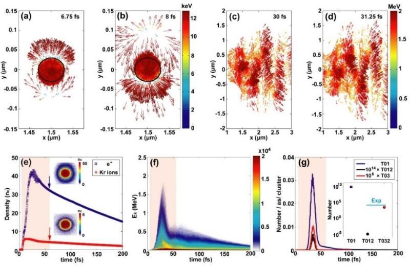 圖 3. 激光團(tuán)簇作用的PIC模擬及庫倫激發(fā)計算。(a-d) 不同時刻激光團(tuán)簇作用的電子分布;(e) 團(tuán)簇區(qū)域電子、離子密度隨時間的演化;(f) 團(tuán)簇區(qū)域電子能量隨時間的演化;(g) 各個激發(fā)路徑的激發(fā)效率及產(chǎn)額。