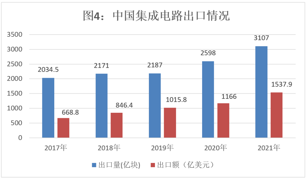 2021年中國集成電路產(chǎn)品進(jìn)出口都保持較高增速。根據(jù)海關(guān)統(tǒng)計,2021年中國進(jìn)口集成電路6354.8億塊,同比增長16.9%;進(jìn)口金額4325.5億美元,同比增長23.6%。2021年中國集成電路出口3107億塊,同比增長19.6%,出口金額1537.9億美元,同比增長32%。