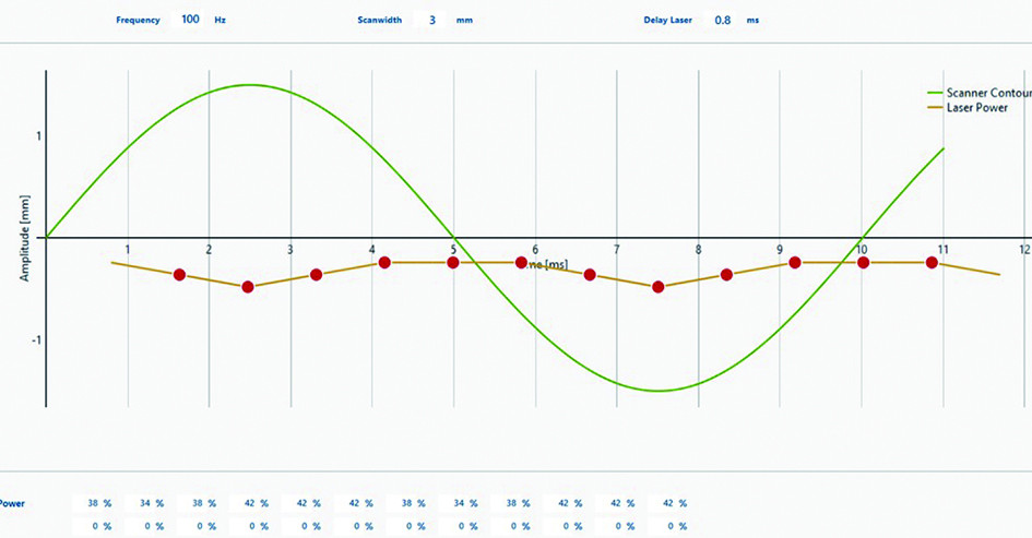 激光熔焊控制系統(tǒng)具備模擬量輸出功能,通過軟件設定參數(shù),可以輸出模擬量給激光器提供所需要的功率,為了穩(wěn)定焊接的質量可以設定呈周期性的功率,在一個周期內(nèi)可設置12組不同功率的參數(shù)。激光束在給定的頻率下進行高速偏擺,設定頻率100Hz的情況下掃描一個周期的時間只需要0.01秒,X向為焊接行進方向,Y向為光束偏擺方向,光束偏擺的幅度可以根據(jù)現(xiàn)場的實際板件情況進行調(diào)整,焊接頭的焦距通過設備來進行實際測量。