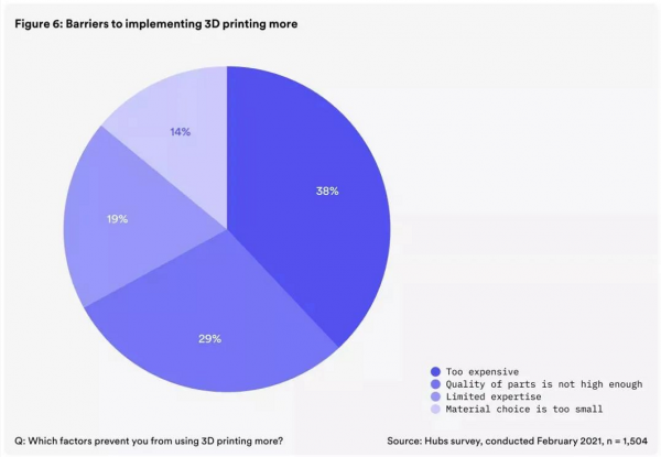 在增材制造技術(shù)的實(shí)際應(yīng)用過(guò)程中,成本成為制約該技術(shù)大規(guī)模推廣的關(guān)鍵因素。38%的從業(yè)者認(rèn)為,增材制造技術(shù)雖然具有獨(dú)特的優(yōu)勢(shì),但是成本過(guò)高,是增材制造的最大軟肋。通常情況下,增材制造只適合復(fù)雜結(jié)構(gòu)件小批量試制。
