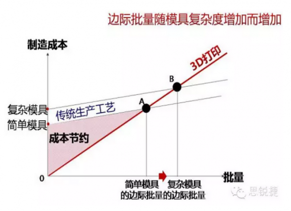 一般認(rèn)為,增材制造的成本優(yōu)勢(shì)與結(jié)構(gòu)復(fù)雜程度和批產(chǎn)數(shù)量密切相關(guān),如果批產(chǎn)數(shù)量超過(guò)平衡點(diǎn),傳統(tǒng)的鑄造、鍛造、機(jī)加等工藝將更具競(jìng)爭(zhēng)力。根據(jù)不同的結(jié)構(gòu)復(fù)雜程度和替代工藝成本,這一平衡點(diǎn)介于數(shù)十件到數(shù)百件之間。