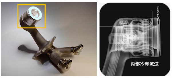 雖然燃油噴嘴只有核桃般大小的結(jié)構(gòu)(黃色方框內(nèi)),里面卻有14條精密的流體通道。這些復(fù)雜的冷卻流道大大提升了冷卻效果,降低了燃油噴嘴積炭的速度,因此噴嘴的使用壽命增加了5倍。