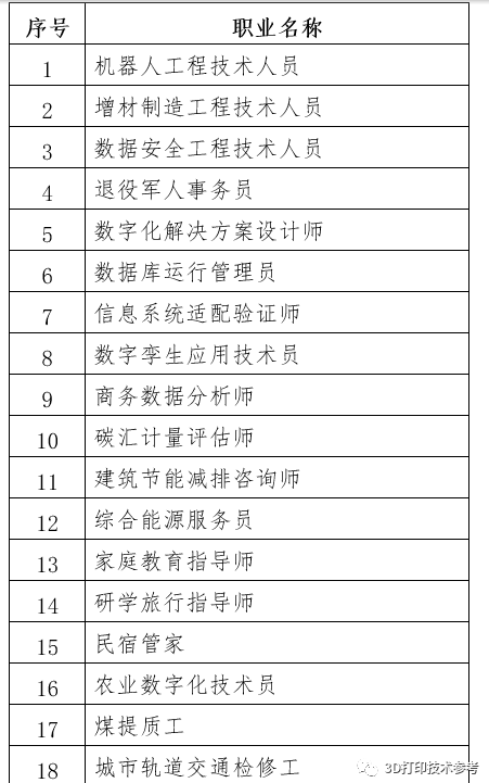 2020年5月,人社部能力司將“增材制造設(shè)備操作員”擬定為新職業(yè),跨出了從以往政策支持學(xué)校培養(yǎng)到職業(yè)認(rèn)可的重要一步。2022年6月14日,人力資源和社會(huì)保障部發(fā)布了最新職業(yè)信息公告,「增材制造工程技術(shù)人員」等18個(gè)新職業(yè)信息作為第一批向社會(huì)進(jìn)行公示。