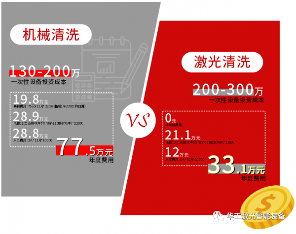 激光清洗裝備相比于機(jī)械清洗,雖前期投入較大,但后期維護(hù)成本低,可節(jié)省人工20%(1臺設(shè)備1人即可操作),降低能源消耗57%,1臺設(shè)備每年節(jié)省成本超50萬元。