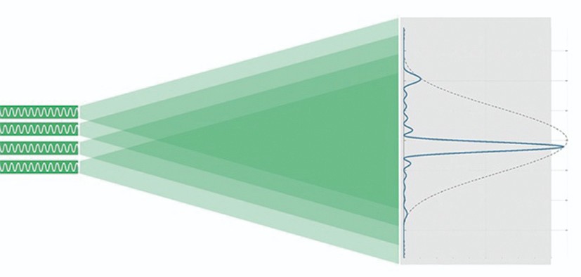 圖2:光學(xué)相控陣。每個激光發(fā)射自己的光,與遠(yuǎn)場中的其他光束重疊形成衍射圖案