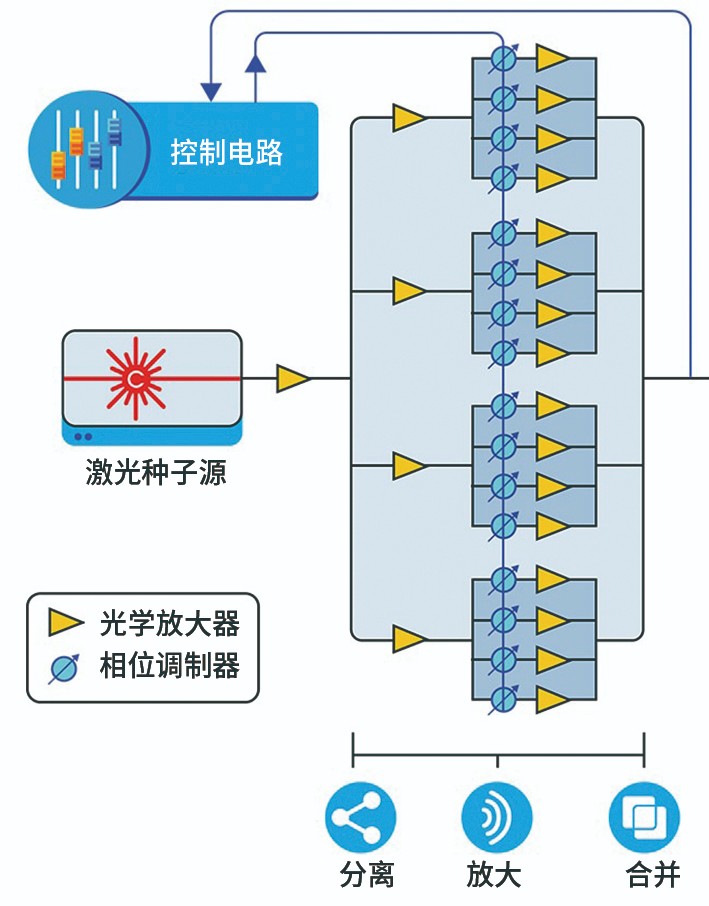圖3:在動態(tài)光束激光器工作期間,來自單種子光纖激光器的光束分裂并通過平行陣列的電光相位調(diào)制器,每個調(diào)制器驅(qū)動一個光放大器