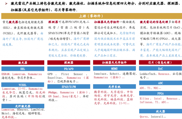 ? 光學系統(tǒng):激光雷達中包含大量的光學和電子元器件。國內(nèi)供應鏈優(yōu)勢顯著,壁壘在于質(zhì)量管控&一致性。光學部分是以發(fā)射和接收這兩個二極管展開的光通道,包括反射鏡,透鏡,棱鏡還有窗口玻璃等;其中,轉(zhuǎn)鏡50%;窗口片:20%;透鏡、準直鏡、濾光片30%。上游的光學組件提供廠商較多,且廠商來自多個不同的領域,包括消費電子領域、光通信領域以及光纖激光器領域,我們認為,未來量產(chǎn)階段,擁有一定技術壁壘和充沛產(chǎn)能優(yōu)勢的廠商有望成為市場主流玩家。