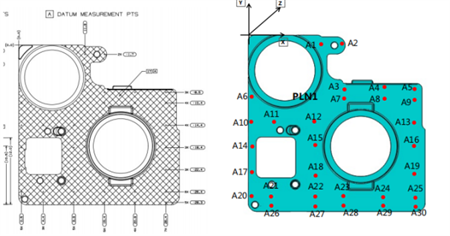 2、多點高度測量工具,測每個點到基準面A的距離,測得30個數(shù)據(jù)最大值和最小值的差值作為平面度結(jié)果;