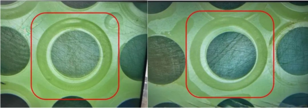 細胞培養(yǎng)板依底部形狀的不同可分為平底和圓底(U型和V型),培養(yǎng)孔的孔數有6、12、24、48、96、384、1536 等,本次焊接測試為96孔的細胞培養(yǎng)板。在激光功率45W、擺動寬度1.2mm、螺旋間距0.1mm、擺動速度120mm/s工藝參數下,焊縫均勻一致、無氣孔、無過燒等缺陷,焊縫撕開后母材殘留,焊縫強度高。