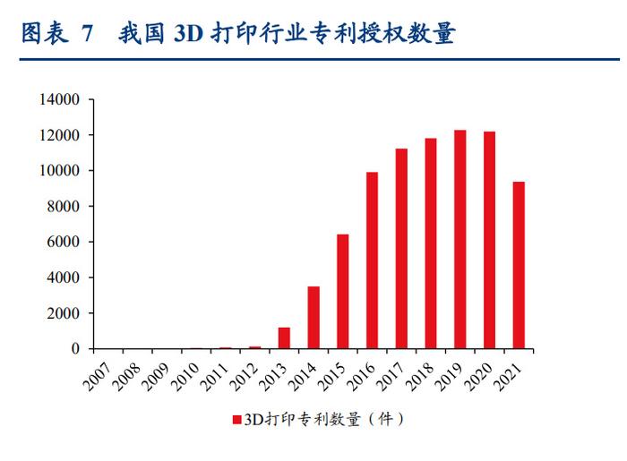 由于我國 3D 打印起步較晚,在 2010 年之前的 3D 打印專利申請數(shù)量較少,2010 年之后 隨著各大科研院所和高校積極參與研究、各大公司積極布局 3D 打印業(yè)務,專利申請數(shù)量 增長較快,雖然 2020 年以來,我國 3D 打印行業(yè)專利授權數(shù)量有所下降,但是絕對指標 數(shù)量仍較大。