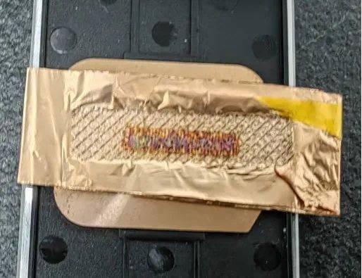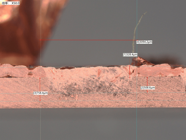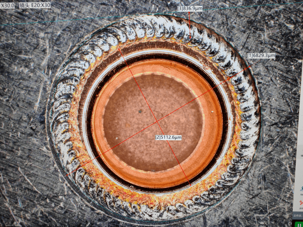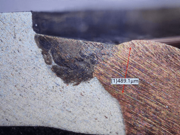 (5)多層極耳與方殼電池極柱焊接,焊接方式:銅箔-銅 疊焊,焊材:50層負(fù)極耳(超聲波預(yù)焊)和方殼電池負(fù)極柱3mm,焊接結(jié)果見(jiàn)下: