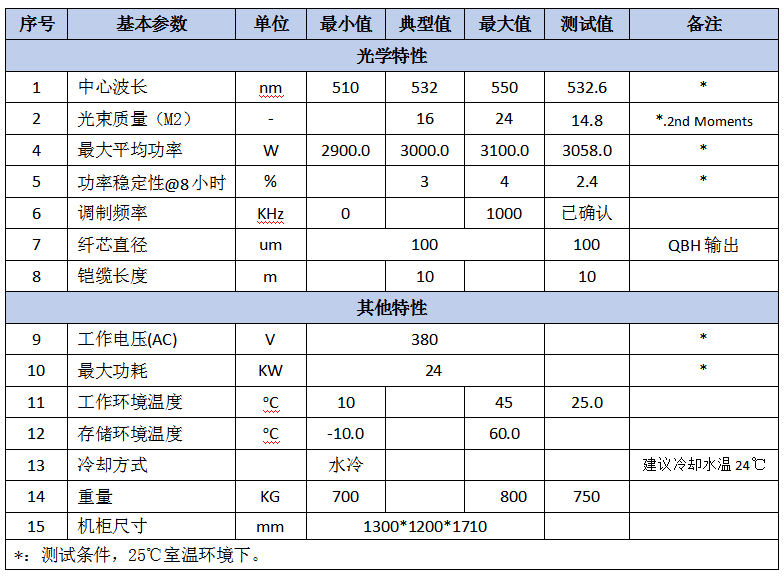 公大激光3000W多模連續(xù)綠光測(cè)試部分?jǐn)?shù)據(jù) 產(chǎn)品PN: GCL-3000-B-I-W