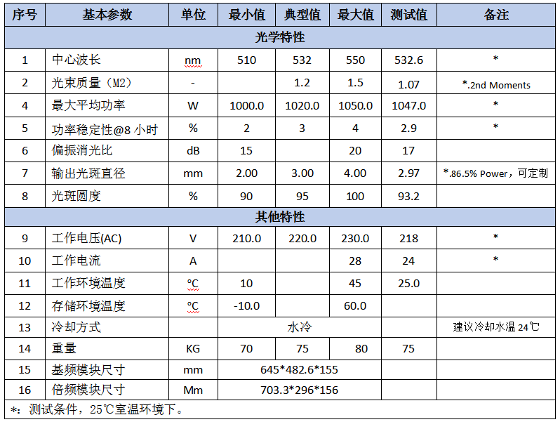 公大激光1000W單模連續(xù)綠光測(cè)試部分?jǐn)?shù)據(jù) PN:GCL-1000-F-S-W