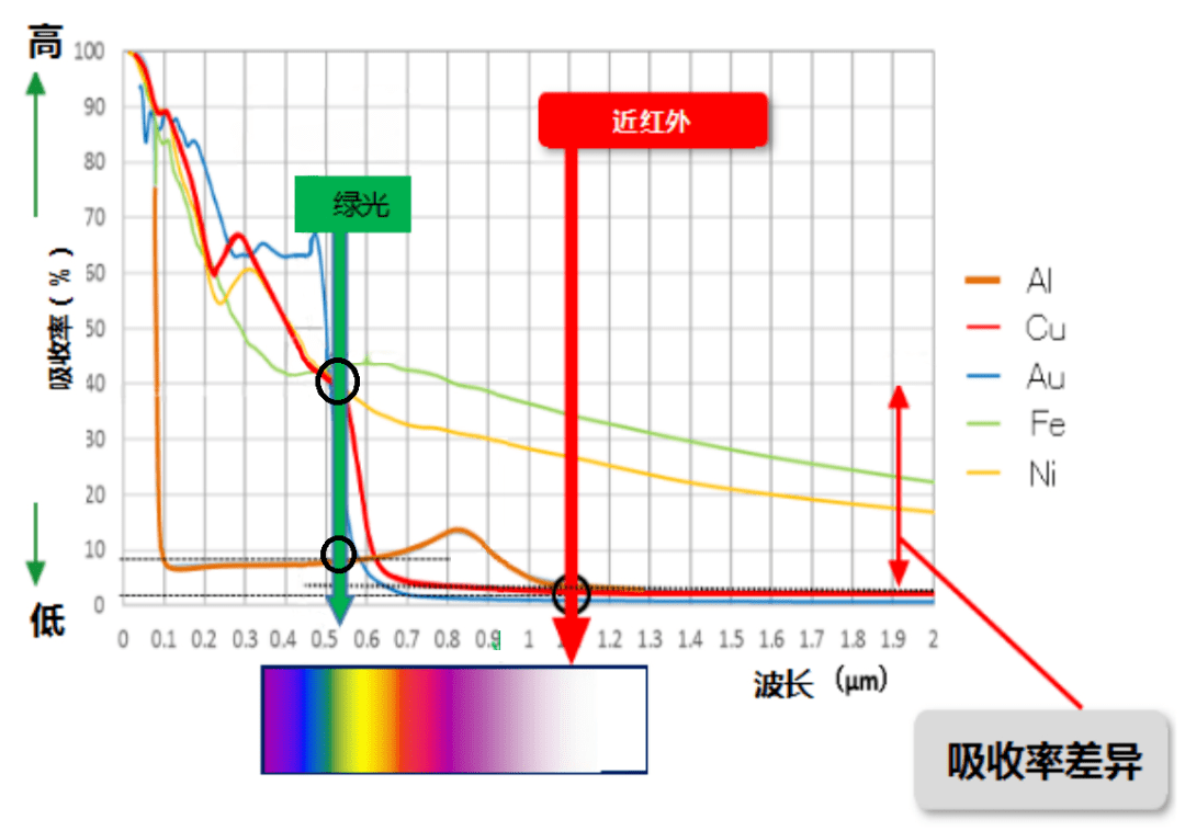 圖-10 常用金屬吸收譜:綠光VS近紅外激光