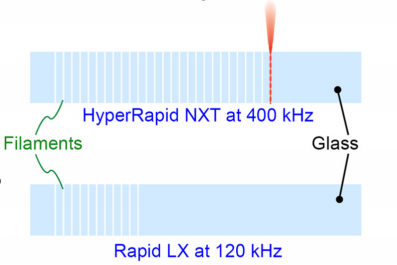 雷射重復(fù)頻率越高,光束在玻璃表面上移動的速度就越快,從而能夠以特定間距打孔。因此,對于切割顯示器玻璃蓋板等大型零件來說,Coherent 的 HyperRapid NXT(重復(fù)頻率最高 400 kHz)的工作速度比 Rapid LX(重復(fù)頻率最高 90 kHz)快三倍,即使這兩種雷射 每脈沖輸出相同的能量,但 HyperRapid NXT 比 Rapid LX 更高頻率、速度更快。