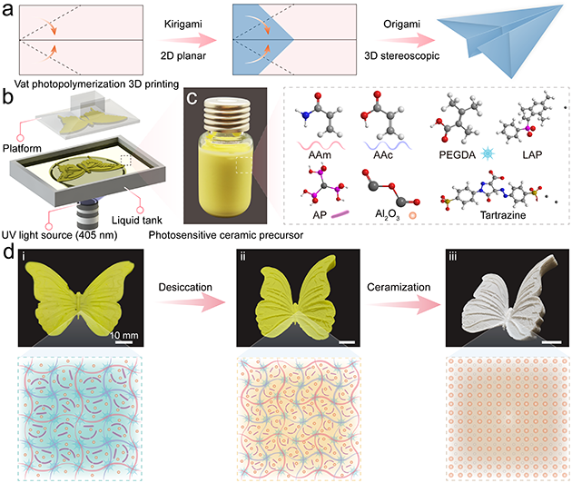該團隊受折紙/剪紙藝術(shù)的啟發(fā),以水性無機粘結(jié)劑磷酸二氫鋁溶膠為水凝膠單體分散介質(zhì),將水凝膠單體和納米陶瓷粉體混合來制備光敏性水凝膠陶瓷漿料;利用光固化3D打印獲得了具有優(yōu)異的延展性、形狀適應(yīng)性、抗疲勞性且可二次變形的水凝膠柔性骨架;依次經(jīng)過脫水干燥、低溫脫脂和高溫?zé)Y(jié)等步驟,實現(xiàn)了具有超低收縮、高陶瓷產(chǎn)率和形狀保真度的懸空大跨度陶瓷結(jié)構(gòu)。該工作設(shè)計的柔性水凝膠基陶瓷前驅(qū)體能夠?qū)崿F(xiàn)從平面形狀到3D立體結(jié)構(gòu)的轉(zhuǎn)變,突破了傳統(tǒng)硬質(zhì)/脆性陶瓷前驅(qū)體制造復(fù)雜陶瓷結(jié)構(gòu)的局限。