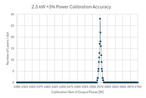 優(yōu)勢究竟有多大?該圖顯示了 90 種不同的 Coherent ARM 可調(diào)環(huán)模光纖激光輸出功率的實際測試數(shù)據(jù)。每個裝置的輸出功率均為 2.575 千瓦。使用外部功率計測量的功率讀數(shù)的標(biāo)準(zhǔn)偏差為 5.4瓦 – 僅為0.2%。 這意味著所有這些雷射對于給定的焊接任務(wù)都會產(chǎn)生幾乎相同的結(jié)果。再次,這確保了參數(shù)能夠隨著時間的推移和多臺雷射“忠實”地再現(xiàn)。
