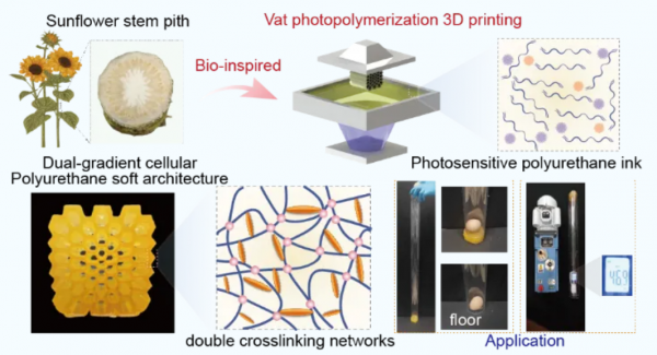 聚氨酯彈性體因其獨特的微相分離結(jié)構(gòu)在減震降噪方面表現(xiàn)良好,輔以多孔結(jié)構(gòu)化設(shè)計可實現(xiàn)更優(yōu)異的阻尼性。研究團(tuán)隊受向日葵髓雙梯度結(jié)構(gòu)啟發(fā),采用高精度光固化3D打印聚氨酯,構(gòu)筑了具有孔徑和壁厚雙變量的仿生雙梯度多孔聚氨酯泡沫。